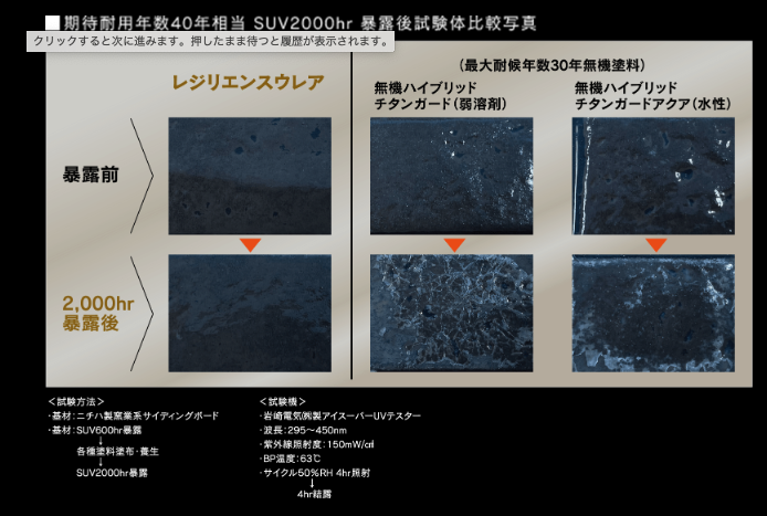 また、第三者機関によるスーパーUV試験機を用いた試験で、レジリエンスウレアは2,000時間の暴露後も良好な塗膜を維持し、年数換算で約40年に相当する結果を出しています。架橋密度が非常に高いため、塗膜表面が緻密で汚れが定着しにくいという特徴もあり、一般的な遮熱塗料と比較して、メンテナンス回数の削減を図れることから、電気代の削減と合わせて大幅なコストダウンも期待できます。